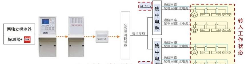 集中控制型:消防電源→集中電源→燈具(主電源和蓄電池電源)