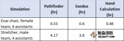 不出所料,Pathfnder的疏散時(shí)間比人工計(jì)算的要長(zhǎng),因?yàn)槿斯び?jì)算不包括由于通過門或在樓梯上轉(zhuǎn)彎而導(dǎo)致的任何減速。對(duì)于疏散椅的情況,Pathfnder的結(jié)果比建筑物疏散計(jì)算短12%。這可能是因?yàn)镻athfnder不包括延遲,例如開門的時(shí)間,這些都包括在建筑物出埃及記的計(jì)算中。對(duì)于拉伸器的情況,Pathfnder的結(jié)果比建筑物出埃及計(jì)算慢10%。這可能是由于在著陸時(shí)擔(dān)架被打開時(shí),Pathfnder中的運(yùn)動(dòng)模式顯著降低了速度。考慮到在Pathfnder和建筑物疏散中運(yùn)動(dòng)建模的基本差異,計(jì)算的疏散時(shí)間可以認(rèn)為是相同的。