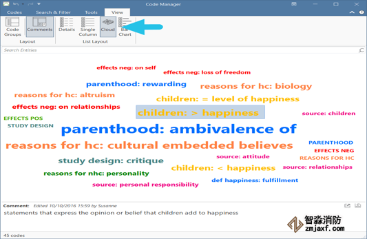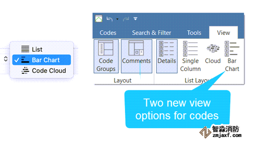 云視圖和條形圖視圖中的代碼與列表視圖中的代碼具有相同的上下文菜單。因此,您可以按照從列表視圖中使用的相同方式處理代碼,即合并、拆分或重命名代碼、編寫注釋、創(chuàng)建智能代碼等。您可以通過代碼訪問新的視圖選項(xiàng)Windows版本中的Manager View選項(xiàng)卡,以及Mac版本中的工具欄: