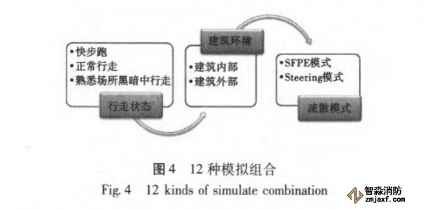 據(jù)前所述, pathfinder軟件有兩種疏散模式進(jìn)行選擇。 現(xiàn)采取其兩種疏散模式即SFPE模式和Steering模式, 對建筑內(nèi)外的人員進(jìn)行了模擬, 一共進(jìn)行了12種組合的模擬, 如圖4所示。