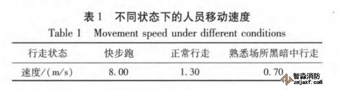 在Pathfinder軟件中設(shè)置的人員疏散模擬關(guān)鍵參數(shù)有人員的移動速度、人員分布情況和疏散模式等等, 這些關(guān)鍵參數(shù)的設(shè)定很大程度上決定了疏散結(jié)果。人員移動速度參數(shù)的設(shè)置人員移動速度是單位時間內(nèi)人員行走的距離, 人員在不同的狀態(tài)下的移動速度是不同的。 根據(jù)該化工生產(chǎn)企業(yè)的實(shí)際情況, 采用三種行走狀態(tài)的值來進(jìn)行模擬。 快步跑這種狀態(tài)適用于緊急狀況的快速疏散, 正常行走適用于一般情況下的員工撤離。 使用“熟悉場所黑暗中行走這種狀態(tài)” 是因?yàn)樵摴S的常駐人員是對廠區(qū)地形非常熟悉的員工, 并且該化工廠采用“三班倒” 式的生產(chǎn)運(yùn)作,意味著夜間也有人在生產(chǎn)線的。 各行走狀態(tài)的取值如表1所示。