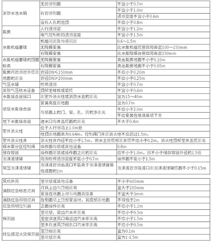 16、消防水池及消防水箱的外壁與建筑本體結(jié)構(gòu)墻面或其他池壁之間的凈距,要滿足施工、裝配和檢修的需要。無管道的側(cè)面,凈距不宜小于0.7m;有管道的側(cè)面,凈距不宜小于1.0m,且管道外壁與建筑本體墻面之間的通道寬度不宜小于0.6m;設(shè)有人孔的池頂,頂板面與上面建筑本體板底的凈空不應(yīng)小于0.8m。